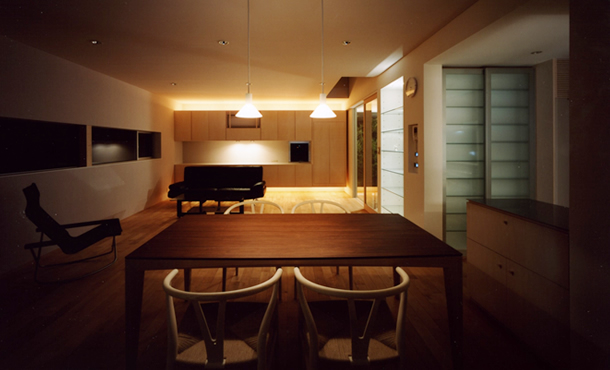 豆砂利洗い出しの土間から入る1階玄関は、正面コンクリート壁の上下に設けられた嵌め殺しの窓、外部に植えられたオカメッタと竹が空間に奥行を感じさせるとともに、1-2階をつなぐ鉄骨階段を軽やかに見せている。浴室は夫婦がのんびりと入浴を楽しめるよう、仕切りにはトウメイガラスを用い、開放的で明るく露天風呂のようなものにした。寝室は、北側のやわらかい光や風、植えられた緑など、自然を感じながらゆっくりと休めるように北庭に面して配した。