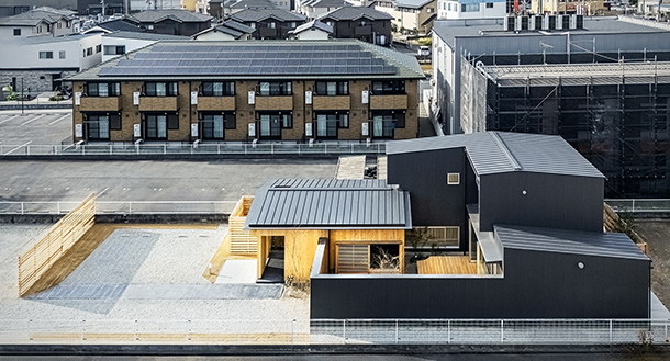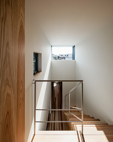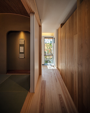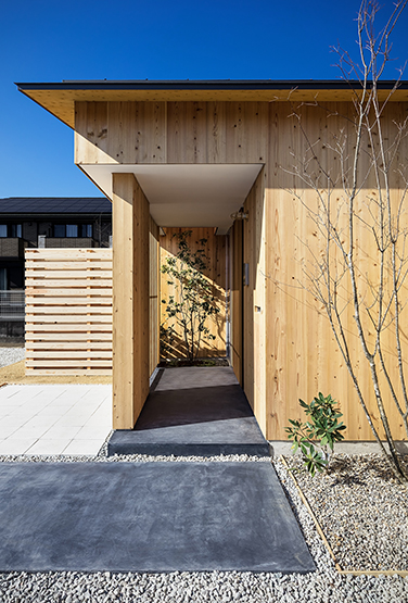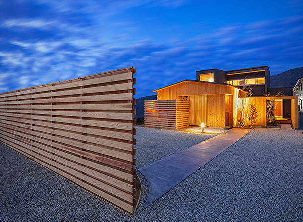 奥行60mの土地を旗竿形状に分筆した幅3m奥行30mの竿部分の先に駐車場とアプローチを設け、建物は前面に平屋建、後面に2階建のボリューム配置とし、長いアプローチから建物、北側の山へと視線が緩やかに繋がる。