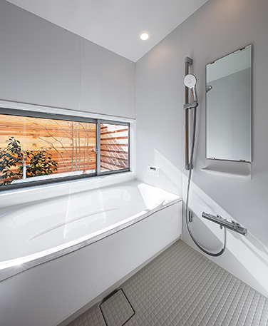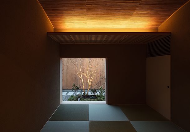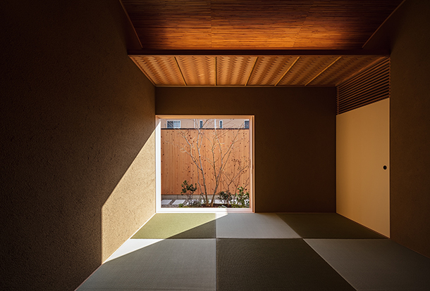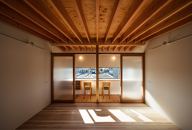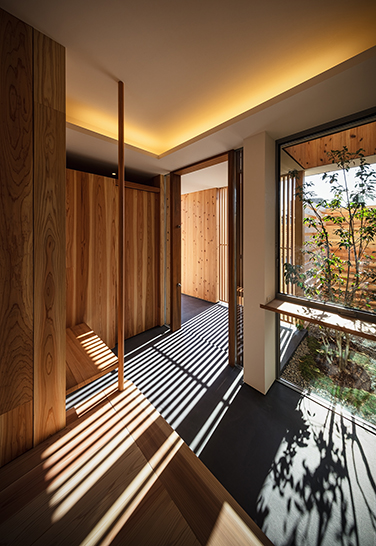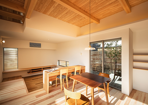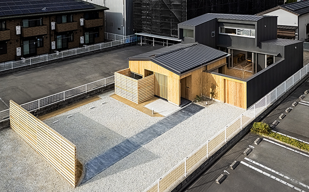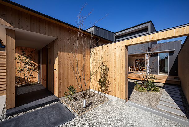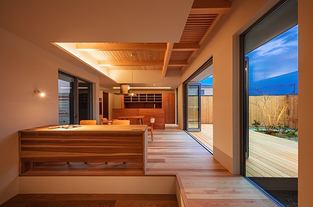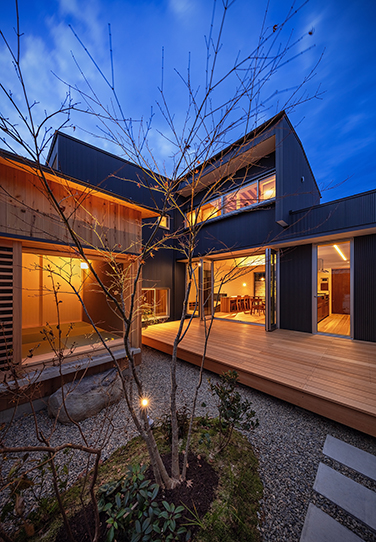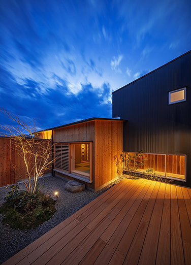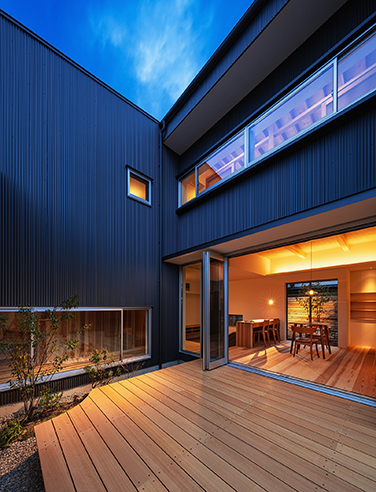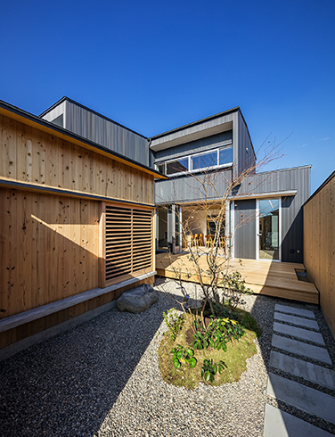平屋建部分に洗面室・浴室・独立した和室、2階に家族の寝室を配置し、家族の中心となる1階北奥に設けたLDKは南側の平屋建ボリュームの壁で囲われたデッキテラスと緑豊かな中庭が一体になり、アプローチと中庭の間に設けた大引戸を開け放つと竿部分・駐車場・アプローチ・中庭が軸線上に連なり、敷地内での外部と内部の回遊が生まれ領域が拡張し、双子の遊び場の可能性も広がる。
